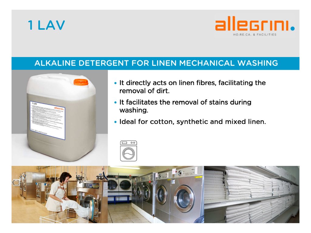 Az 1LAV egy erősen lúgos termék, amely gazdag komplexképző és diszpergáló anyagokban, és kizárólag automata adagolókészülékekkel együtt , a 2 LAV termékkel kombinálva használható pamut, műszálas és vegyes ruhák gépi mosására.