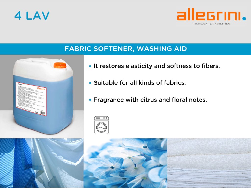 A 4 LAV visszaadja a szálak rugalmasságát és puhaságát, megkönnyíti a hagyományos és mangolos /gőzölt hengeres/ vasalást, valamint antisztatikus hatást biztosít. Alkalmas minden típusú textíliához, de különösen a gyapjúhoz és a finom vászonhoz.