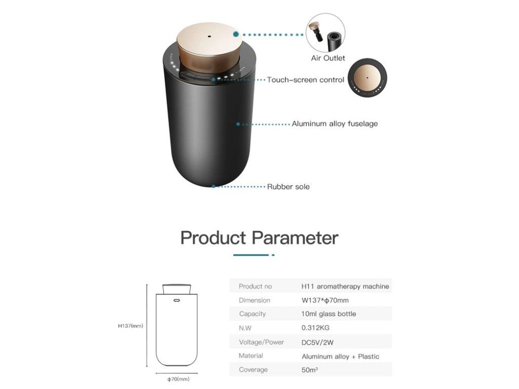 A kompakt méretű, elegáns kialakítású diffúzor praktikus és hordozható megoldás az illatosításra - bárhol, bármikor használható, és hosszan tartó friss illatot biztosít. Ezek a kis diffúzor ideális kisebb helyiségekbe, például autóba, irodába, nappaliba, vagy masszázsszobába. Az illatporlasztó egyenletes szórja az illóolajat, nem hagy folyadéknyomokat. A készülék beépített, USB-kábellel tölthető lítium akkumulátorral rendelkezik.