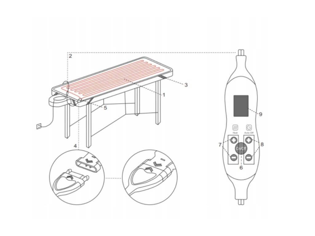 Távirányítóval vezérelhető elektromos fűtőpárna, amely lehetővé teszi a hőmérséklet és a melegítési idő szabályozását. A párna 70 x 180 cm méretű masszázsasztalok fűtésére szolgál. A párna praktikus fogantyúkkal rendelkezik az asztallaphoz való rögzítéshez. A maximális kényelem érdekében érdemes egy további védőhuzatot használni a párna tetején.