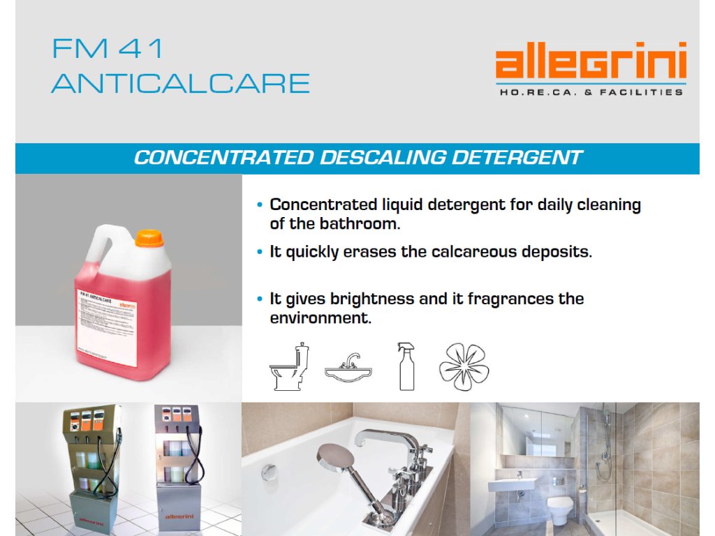 Az FM 41 ANTICALCARE egy erősen koncentrált folyékony mosószer WC-k, WC-k, zuhanyzók stb. napi tisztítására és karbantartására, amelyet kifejezetten az FM5 automatikus hígítórendszerben való használatra fejlesztettek ki. A termék savas alapú, és egyedülálló módon oldja fel a vízkövet, a szennyeződéseket és a szappanlerakódásokat. Visszaadja a felületek fényét, és kellemes ribizli illatot hagy maga után. Ideális sportlétesítmények, öltözők, szaunák és pezsgőfürdők tisztítására.