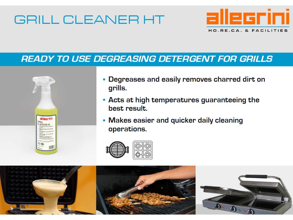 Számos élelmiszeripari vállalkozás - például éttermek, bárok, étkezdék, büfék, gyorséttermeknek stb. - gyakran keres gyors és hatékony megoldást a profi konyhai eszközök napi tisztításához. Az ilyen jellegű vállalkozások számára fontos, hogy az eszközök gyorsan és alaposan tisztíthatóak legyenek, így naponta többször különböző típusú ételekhez is használhatóak. A GRILL CLEANER HT egy használatra kész zsírtalanító, amely képes kielégíteni ezeket az igényeket. Különleges összetételének köszönhetően ideális minden típusú grill - például a rácsos-, lapos- és szendvicsgrill - tisztítására, magas hőmérsékleten való használata mindig a legjobb eredményt biztosítja. Használat közben nem bocsát ki kellemetlen szagokat vagy veszélyes anyagokat!!! A GRIL CLEANER HT könnyedén eltávolítja még a legmakacsabb ráégett és nehezen eltávolítható szennyeződéseket is anélkül, hogy károsítaná a felületeket.