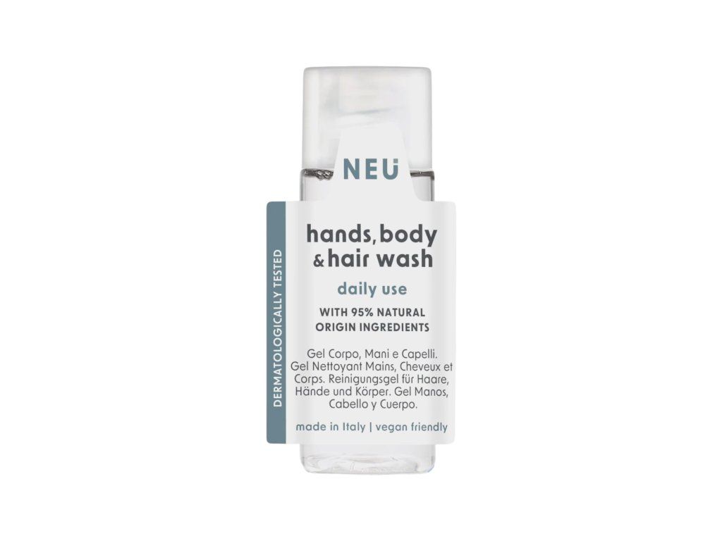 A friss virágos illatú NEU Haj-, Test- és Kézápoló Gél tisztaságérzetet és kellemes frissességet biztosít egész nap. Vegán összetétele 95%-ban természetes eredetű összetevőket tartalmaz, így gyengéd a bőrhöz és a természethez. Praktikus, multifunkcionális szállodai kozmetikai termék, amelyet a vendégek maximális kényelmére terveztek tartózkodásuk alatt. Egyetlen termékben egyesíti a test, a kéz és a haj gyengéd ápolását, így egyszerű és hatékony megoldást kínál a mindennapi higiéniára.