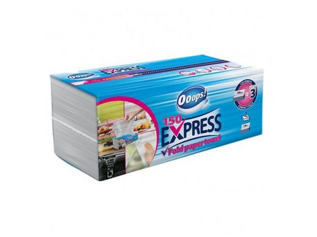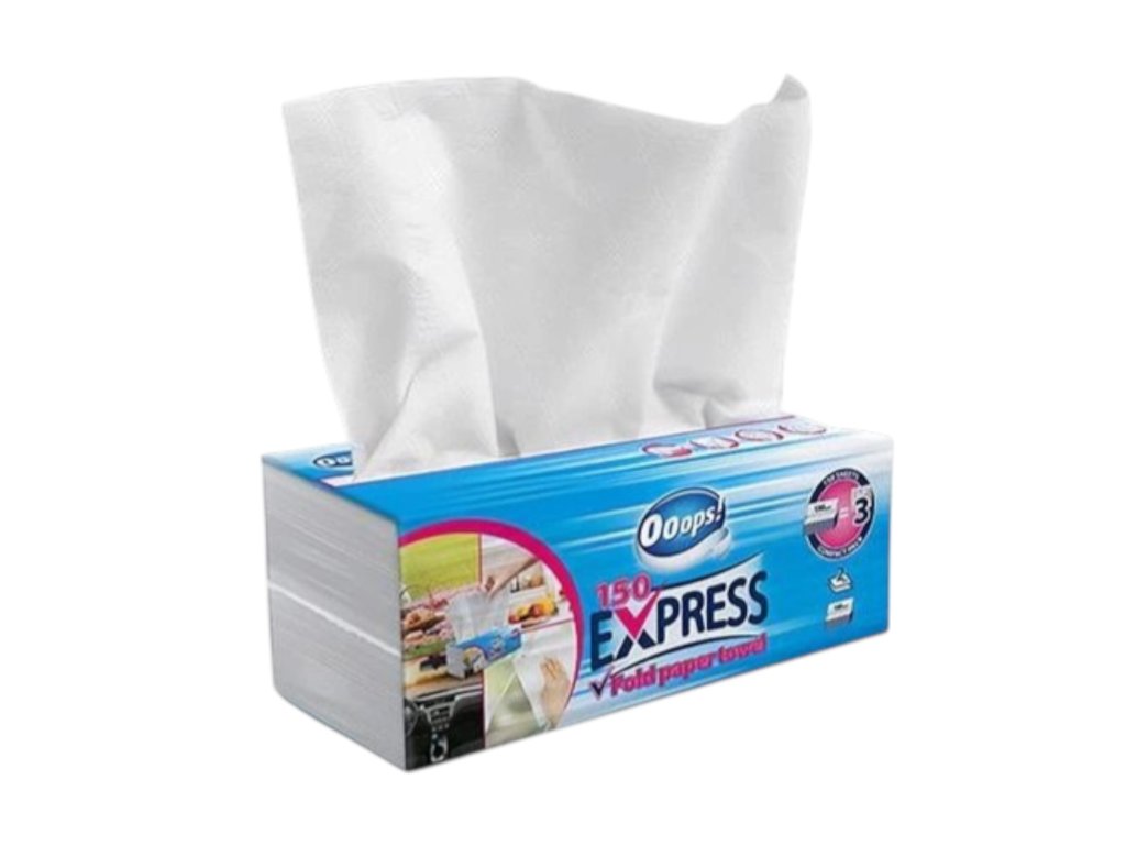 Ooops! Az Express 150 hajtogatott papírtörlő ideális választás bármilyen felhasználásra - otthonra, utazáshoz, szabadtéri tevékenységekhez vagy autóápoláshoz. A V-hajtás technológiának köszönhetően az egyik törlőkendő kihúzása után automatikusan megjelenik egy másik, használatra kész. Ez csökkenti a hulladékot, mivel csak a szükséges mennyiségű papír kerül felhasználásra. A vízálló csomagolás megvédi a törlőkendőket a szennyeződéstől a használatuk során.