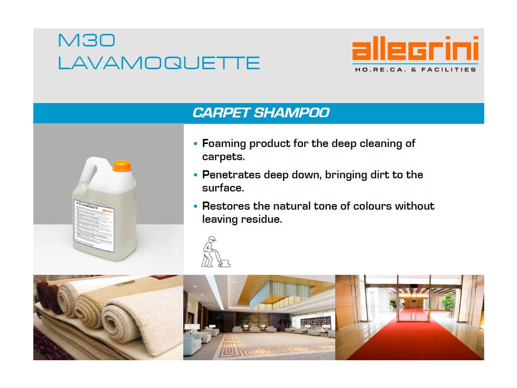 A textil szőnyegek tisztítása gyakran nehézkes, ha nem megfelelő, speciális készítményt használunk. Az M30 LAVAMOQUETTE egy erősen habzó, kiemelkedően hatékony tisztítószer, amely ideális a szőnyegek mélytisztításához nedves gépi samponos módszerrel. A szálak gyökeréig hatol, eltávolítja a szennyeződéseket, hogy a felszínre hozza őket, így egyszerűen felszívható porszívóval. Visszaállítja a színek természetes árnyalatát mindenféle lerakódás nélkül. Az M30 LAVAMOQUETTE védőréteget képez a szálak körül, így segít hosszabb ideig tisztán tartani a felületet.