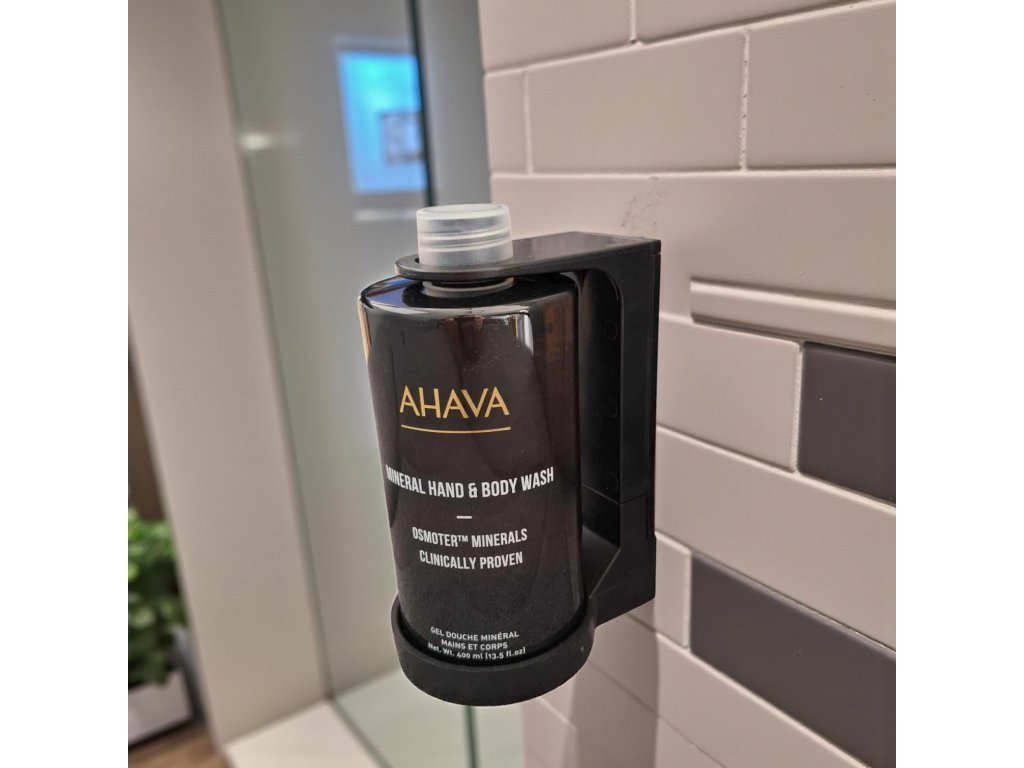 Kiváló minőségű műanyag kozmetikai tartó az AHAVA, OSCAR DE LA RENTA márkától elegáns fekete színben. Megvédi a pumpás adagolókat a lopástól, és egyúttal illeszkedik bármilyen fürdőszobai dizájnhoz. A mellékelt kétoldalas ragasztószalaggal a falra ragasztható, vagy közvetlenül a falba szerelhető (dübelek és csavarok nem tartozékok).