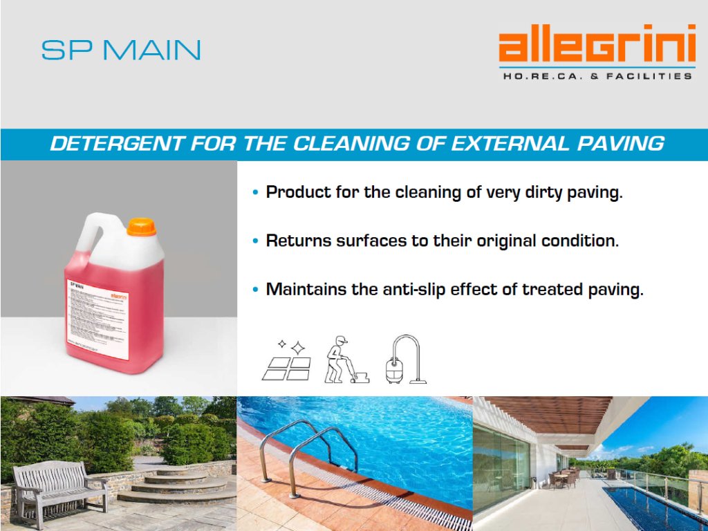 A légköri hatásoknak kitett porózus felületekhez, például kőagyaghoz, kőhöz vagy porfírhoz alkalmas termék. Megakadályozza a szennyeződések lerakódását és a csúszós patina kialakulását. Az erősen szennyezett csempék speciális tisztításához az Allegrini SP MAIN tisztítószert kínál, amely vízzel érintkező csempék (úszómedencék, szaunák, zuhanyzók, szépségszalonok) mélytisztítására szolgál. Az SP CLEAN-nel együtt garantálja a hosszú ideig légköri hatásoknak és mindenféle szennyeződésnek kitett felületek helyreállítását, visszaállítva azokat eredeti állapotukba. A terméket alacsony nyomású szórófejjel kell felvinni és ecsettel át kell oszlatni a felületen a különféle szennyeződések eltávolítása érdekében. Az SP MAIN megőrzi a felület csúszásgátló tulajdonságait anélkül, hogy megváltoztatná a csempék szerkezetét vagy megjelenését, valamint az alapréteget vagy a rögzítőanyagot. Ideális szállodák, éttermek, gyógyfürdők és sportközpontok számára.
