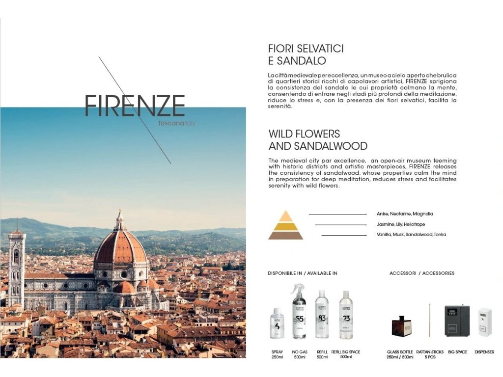 Firenze, a középkori város megtestesülése, egy szabadtéri múzeum tele történelmi negyedekkel, gazdag művészi remekművekben. Firenze a szantálfa állagát fejezi ki, amelynek tulajdonságai megnyugtatják az elmét, mélyebb meditációs állapothoz vezetnek, csökkentik a stresszt, és a vadvirágokkal együtt elősegítik a nyugalmat.